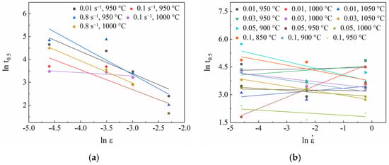 where t0.5 is the required time for 50% of recrystallization, and X1, X2 are the SRX constants of Equation (5). The parameter t0.5 is affected by several factors, including the deformation temperature [22,23], plastic strain, strain rate, and the initial austenite grain size, and can be expressed by Equation (6):