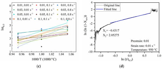 are the material-related constants in Equation (6), is the amount of prestrain, is the strain rate, T is the deformation temperature, is the activation energy for SRX, and the parameter R is the universal gas constant. The corresponding values for , , X1, and X2 can be obtained as described in Section 3.3.