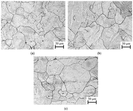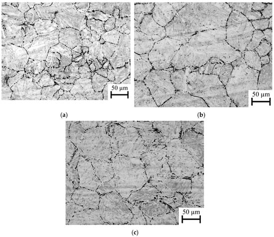 Optical investigated microstructures of SRX at a prestrain of 0.03, a strain rate 0.1 s−1, and deformation temperatures of (a) 950 °C, (b) 1000 °C, (c) and 1050 °C after stress relaxation tests for 22MnB5 boron–manganese steel.