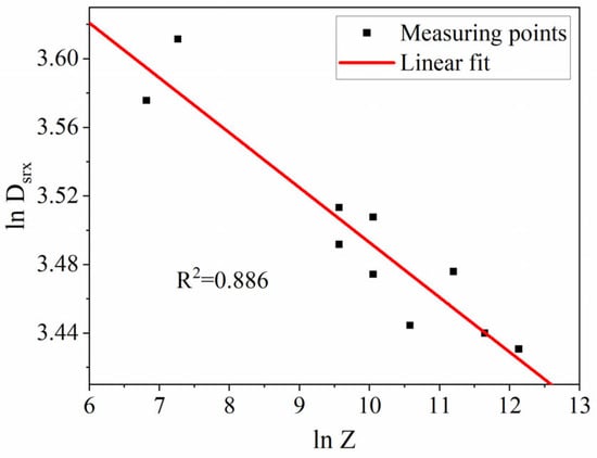 By substituting different values of Dsrx and Z, corresponding to various deformation conditions, into Equation (16), the interaction between the natural logarithms of Z and Dsrx is revealed, as illustrated in Figure 11. Consequently, the values of C and m were precisely calculated as 45.2779 and −0.03198, respectively. This led to the formulation of the mathematical model describing the evolution of grain size resulting from SRX in 22MnB5 steel, expressed as: