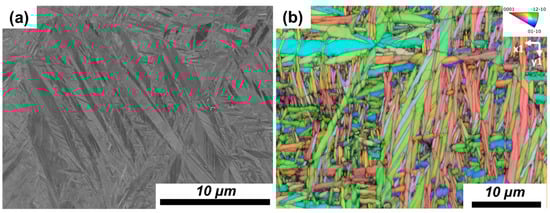 The microstructure was examined using a scanning electron microscope (SEM) from Centre de Microcaractérisation Raimond Castaing, Toulouse, France. A Jeol 7800F microscope equipped with a field emission gun was used for high-resolution imaging. A Jeol JSM 7100F equipped with a CMOS electron back-scattered diffraction (EBSD) detector (Symmetry S2, Oxford Instruments, Abingdon, UK) and Aztec 5.0 acquisition software was used for grain and misorientation analysis. An accelerating voltage of 20 kV, a probe current of 13 nA, and a working distance of 15 mm were used. The microstructure of the as-built state is presented in Figure 1. It is fully martensitic (α’) and exhibits numerous twins within α’ laths. This out-of-equilibrium microstructure is related to high cooling rates (105–107 K/s), as commonly observed [,].