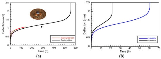 SPCT curves showing the evolution of deflection versus time for tests performed at 450 °C and σinitial = 400 MPa (a); SPCT curves showing the effect of the initial stress σinitial at 500 °C (b). Note the different time scale in both figures.