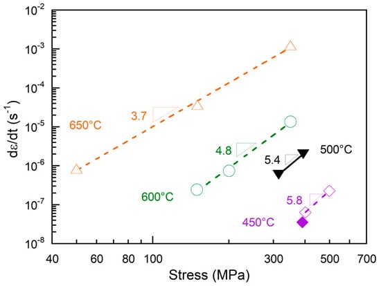 From , we deduced the values of the minimum creep strain rate and stress σ using empirical equations and coefficients reported as Equations (3) and (4) [].