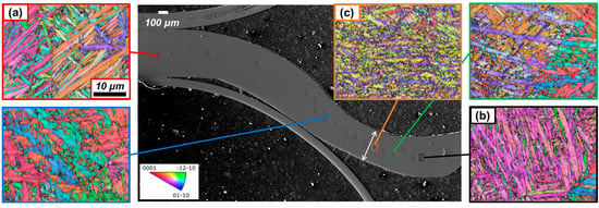 Since the as-built microstructure of Ti64 presents an out-of-equilibrium martensitic microstructure, it is likely that such a microstructure may evolve during the creep test. Such evolution was characterised via SEM observation of interrupted SPCT specimen’s cross-section. Interrupted tests and the characterisation of the microstructure were performed for SPCT conducted at both 450 and 500 °C. However, in the present paper, we focus on the microstructure evolution observed after 450 °C creeping. More precisely, we report observations performed on the interrupted SPCT presented with the red curve in Figure 2a. Indeed, in order to assess the effect of mechanical loading on the phase transformation, we selected a temperature for which we did not observe phase transformation without loading (unloaded heat treatment at 500 °C resulted in a slight transformation of the martensite with some small β particles forming at boundaries). The interrupted test specimen cross-section was obtained by means of a cut through the centre of the deformed dome that was then embedded and prepared for metallographic observations. The central image in Figure 4 is a SEM secondary electron image showing half of the specimen cross-section gripped by clamping rings. The disc specimen is bent downwards by the deflection caused by the punch during SPCT. It is noticeable that the thickness of the section is not constant along the section, indicating inhomogeneous creep deformation. The upper left part, which was between the dies, did not undergo plastic deformation and retained its initial thickness (500 µm). The rest of the sample is more or less deformed. It can be seen that the thinnest section, i.e., the most deformed part—indicated by a white arrow—does not correspond to the apex at the bottom of the image but is located on the side of the dome, in good agreement with FEA calculations reported in the literature [,].