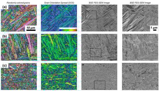 The microstructure variations along the transverse section were observed via SEM EBSD and are presented in the five inserts showing the inverse pole figure along the z direction (normal to the image)—IPF-Z. Note that all EBSD images that are displayed in this paper include the mentioned signal (e.g., here IPF-Z), which is superimposed to the index quality map and large-angle grain boundaries. The IPF taken from the left part of the section shows the typical acicular feature of the martensitic microstructure (insert a). Acicular microstructure is also retained at the top of the punched zone in insert b, while this microstructure is heavily disrupted in between with a paroxysm shown in insert c, which corresponds to the maximum of plastic strain. The microstructure of those three zones, a, b, and c, were analysed in more detail, as will be presented in Figure 5 below. From the cross-sectional thicknesses at the location of each zone, it is possible to associate each microstructure with a plastic deformation level. Zone a, located between the dies, is not deformed; zone b, located at the apex, corresponds to a creep strain of 16%, and zone c, to 36%. For this latter case, the literature on the FEA of SPCT indicates that the local strain level would even be higher than 36% since the strain is also heterogeneous over the disc thickness []. Figure 5 reports observations of these three zones using different observation conditions. In the two left-hand columns, we show EBSD analyses complementary to the IPF-Z. The images in the first column show the grains in random colours; adjacent grains are defined by a disorientation of 10°. This series clearly shows the overall changes in grain microstructure in terms of morphology and size along with the increase in creep strain. The second column is the grain orientation spread (GOS) angle, which reveals the amount of misorientation and thus the plastic strain within the grains. The two right-hand columns are SEM back-scattered electron (BSE) images, allowing higher resolution in order to visualize the fine microstructure. The third column corresponds to the same magnification and area as the EBSD maps, while the fourth column is a zoom on the selected area indicated by the dashed frame. These last images evidence the very fine morphology of the microstructure and reveal the decomposition of the α’ martensite that gives rise to the precipitation of β phase, visible with white contrast in those BSE images due to the higher V content. The evolution of the microstructure can be described as follows. In case (a), the microstructure remains martensitic and no change could be noticed as compared to the as-built state as reported in Figure 1. The martensitic microstructure is characterised by tangled lamellae with a high aspect ratio and quite a large distribution of lamellae sizes. The smallest ones are 80 nm wide by 1.3 µm long, while the largest are around 1 µm wide by up to 10 µm long and exhibit internal features that were identified as twins []. As the level of plastic/creep deformation increases, like in zone (b), the microstructure still shows an acicular aspect; however, significant changes occurred. The smaller needles have disappeared and are replaced by sub-micron globular grains, while the larger ones are fragmented. For the maximum of creep deformation, which corresponds to zone (c), the microstructure is completely transformed. Most of the grains are globular with a diameter around 250 nm. This transformation is associated with an evolution of the GOS values in the different grains of the microstructure. In Figure 5, the GOS values are indicated using the same colour scale for all three areas, allowing a direct comparison. The unstrained (a) area exhibits very small and quite uniform GOS values throughout the area analysed. In zone (b), the GOS values increase significantly in acicular regions but are very low in areas with globular grains. And finally, in zone (c), all the areas exhibiting nanograins show very low values of GOS. These observations clearly indicate that the nanograins were formed through dynamic recrystallisation during creep deformation. The column to the right in Figure 5 shows an increasing presence of the white precipitates which correspond to the β phase. Image analysis gives some rough estimate of the β phase volume content, which is less than 0.5% for zone a, around 1.5% for b, and 2.3% for zone c. There is a clear correlation between the volume fraction of the β phase and the amount of creep strain, evidencing the fact that plastic deformation locally enhances martensitic decomposition.