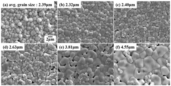 FE-SEM images and average grain sizes of (a) 5CSZ, (b) 6CSZ, (c) 7CSZ, (d) 8CSZ, (e) 9CSZ, and (f) 10CSZ specimens after post-heat treatment (same magnification).