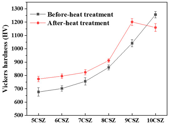 Vickers hardness of Ca-PSZ before (black scattered line) and after (red scattered line) post-heat treatment.