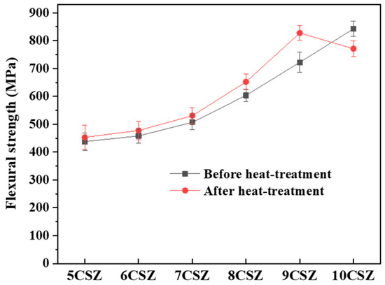 The mechanical properties of Ca-PSZ evaluated by the Vickers hardness and flexural strength of Ca-PSZ are displayed in Figure 4 and Figure 5, respectively. Increasing the CaO content from 5CSZ to 10CSZ increased the Vickers hardness and flexural strength from 676.02 to 1256.25 HV and 437.7 to 842.7 MPa, respectively (see black lines in Figure 4 and Figure 5). As shown by the red lines in Figure 4 and Figure 5, the post-heat treatment enhanced the mechanical properties from 5CSZ to 9CSZ. Vickers hardness increased from 773.58 (5CSZ) to 1201.26 HV (9CSZ), and flexural strength increased from 453.1 (5CSZ) to 827.7 MPa (9CSZ). However, a marginal decrease (approximately 7%) in Vickers hardness (1159.34 HV) and flexural strength (771 MPa) compared to 9CSZ was observed in 10CSZ after the post-heat treatment. Even with the results of 10CSZ, the mechanical properties based on the Vickers hardness and flexural strength tests of the specimens from 5CSZ to 10CSZ were significantly enhanced by increasing the Ca content and applying the post-heat treatment, compared to the previous study [28]. As expected, the Vm values of all specimens before and after the post-heat treatment decreased, and this was related to the portion of the Ca2+ substitution for Zr4+.