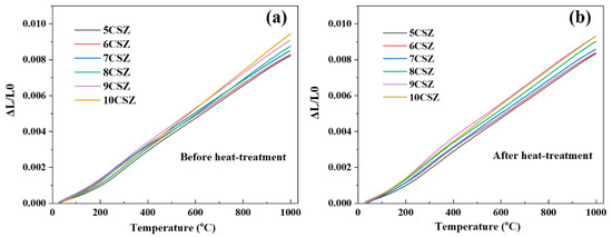 Thermal expansion coefficient curves of Ca-PSZ (a) before and (b) after post-heat treatment.