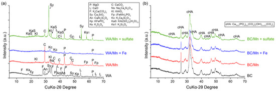 The complex mineralogy of pristine WA is shown in Figure 1a. The shape of the XRD baseline indicates the presence of amorphous solids, while the principal crystalline phases were dicalcium silicate (Sy: Ca2SiO4) and fairchildite (F: K2Ca(CO3)2). Although calcite is a common component in the bottom biomass ashes [18,38], ash mineralogy is controlled by the relative ratios of the dominant ash-forming cations and reaction temperature. The formation of fairchildite instead of calcite relies on the wood’s initial K:Ca ratio [39] and can be associated with a high K content in the WA sample (Table 2). The interaction between Mg and Ca or K is insignificant during ash formation, usually leading to the periclase (P: MgO) formation [39], as identified in the WA. The relatively high level of CaO (L) in WA is typical for wood sources. Furthermore, the minor shares of potassium dithionate (Ks: K2S2O6), anorthite (An: CaAl2Si2O8), and potassium-iron-phosphate phase (Kp: KFePO4) were present in the sample.