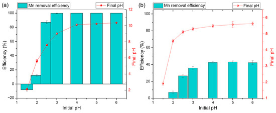 Relations between the initial pH, final pH, and Mn removal efficiency in the system with WA (a) and BC (b). Dose 1 g/L, Mn concentration 100 mg/L, 24 h contact time.