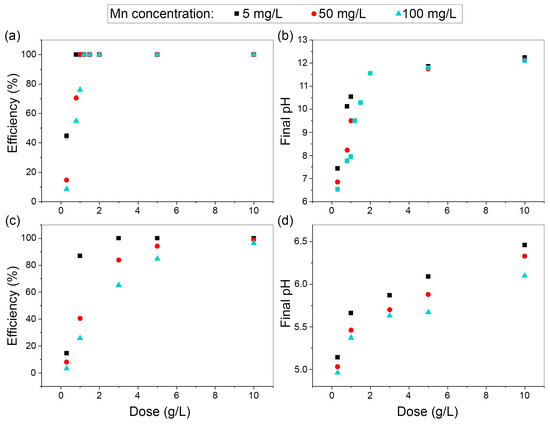Effect of reagent dose on Mn removal efficiency and final pH values in the systems with WA (a,b) and BC (c,d). Initial pH 2.5, contact time 24 h.