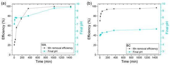 Based on the previous experiment, the manganese removal rate from the synthetic AMD (initial pH 2.5, 100 mg/L Mn) was investigated at 1.2 g/L WA and 10 g/L BC doses. Already after 5 min of contact, 70.3% of Mn was removed by BC and 20.7% by WA (Figure 4a,b). The efficiency of the treatment changed markedly up to 6 h, which was sufficient for the BC system to reach equilibrium (96%). The equilibrium time of Mn removal from 100 mg/L solution at the initial pH of 5.8 was found to vary from several hours to a few days using a commercial bone char, depending on particle size and bone char/solution ratio [21]. On the other hand, WA removed 95.6% of Mn in 6 h, and the performance continued to increase up to 100% within 17 h of contact.