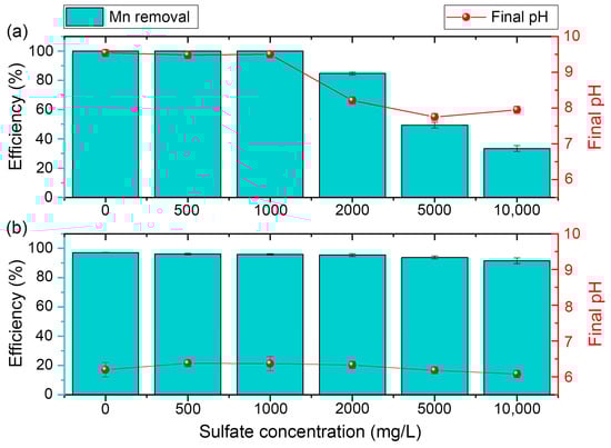 Up to 1000 mg/L, sulfate anions did not interfere with Mn removal. With WA, the final pH values of ~9.5 provided conditions for total Mn removal (Figure 5a). The presence of sulfate in the solution slows down the Mn oxidation rates even at pH > 9, at least in part due to the presence of the MnSO4 (aq) complex [47]. However, the reaction time of 24 h was sufficient to accomplish complete Mn removal by oxidation/precipitation at such a pH. A decrease in WA efficiency to 84.7% occurred at 2000 mg/L sulfate and continued with increasing sulfate concentration so that at 10,000 mg/L, only 33.4% Mn was separated. In parallel, the solution pH gradually decreased, reaching a final pH of 8.0 at the highest sulfate concentration.