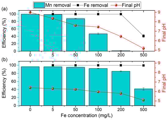 By applying BC, Mn removal of 96.2–85.2% was achieved from 5 mg/L Fe up to 200 mg/L Fe, while it declined to 41.5% at 500 mg/L Fe (Figure 6b). In parallel, Fe ions were entirely removed in all experimental runs, and the pH value of the solution decreased from 6.3 to 5.1 (Figure 6b). At initial pH 2.5, partial dissolution of a preselected dose of BC has provided a sufficient pH increase, phosphate anions release, and an abundance of active centers for effective Mn(II) removal by phosphate precipitation and chemisorption even at twice the concentration of Fe ions.