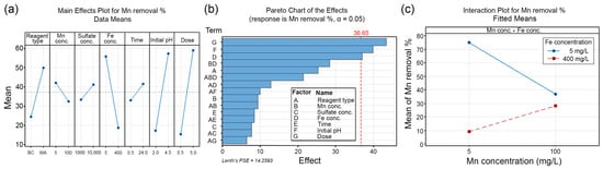 Main effect plots for Mn removal (a), Pareto chart of the effects of variables (b), and interaction plot for the effects of Mn and Fe concentrations (c).