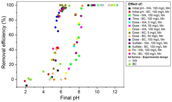 - The impact of all investigated process factors and their interactions on Mn removal efficiency can be seen indirectly through their ability to bring the pH to or further from the optimal pH values for BC or WA action. Such insight helps optimize the conditions of the Mn removal process by adjusting the pH value in the system, which can be done successfully by optimizing the reagent dose.