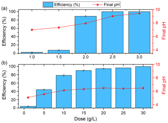 The variations in Mn removal efficiency and final pH values of AMD treated with WA and BC are presented in Figure 9. The increase in WA dose from 1.0 g/L to 3.0 g/L provoked a substantial pH rise from 7.0 to 9.4 and a consequential increase in Mn removal from 2.5% to 100%. At 2.5 g/L, 99.9% of Mn was removed at pH 9.0. Likewise, a rapid progression in Mn removal (4.2–90.1%) was detected as the quantity of applied BC raised from 1.0 g/L to 15 g/L. Process efficiency continued to increase with a further increase in the BC dose up to 30 g/L, gradually reaching 99.9%. In the entire range of BC doses, the final pH of AMD increased from 5.1 to 6.5.