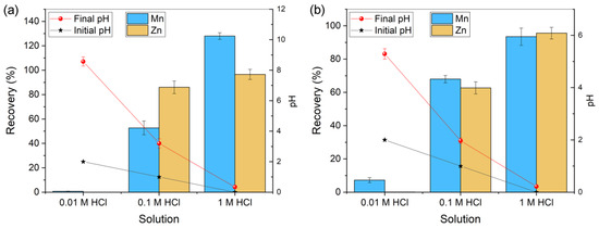 The prospects for recovery of AMD major metals from the treatment residues are presented in Figure 10. With increasing HCl concentration, Mn and Zn release rates from WA residue significantly increased, from 0.7% to 127% and from 0% to 96%, respectively, as the final pH decreased from 8.5 to 0.34. In 1 mol/L HCl, WA residue was virtually completely dissolved, thus releasing the Mn from the AMD treatment process and the WA composition (Table 2). Considering the BC residue (Figure 10b), Mn recovery with 0.01 mol/L HCl at final pH 5.3 was 7.2%, while Zn detachment was marginal (0.13% and 0.68%). The Mn and Zn recovery reached maximally 93% and 95% in 1 mol/L HCl due to almost complete BC residue dissolution at the final pH of 0.2.