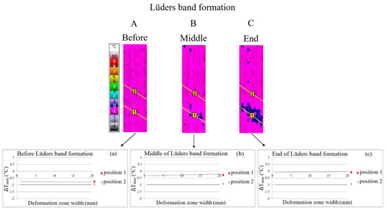 The results of thermography qualitative line analysis are presented at the moment before the start of the Lüders band formation (A), the middle of the Lüders band formation (B) and at the end of the Lüders band formation (C) (Figure 2). An examination of the line analysis was carried out at position 1, which corresponds to the area of the Lüders band formation, and at position 2, which corresponds to the area in front of the Lüders band front without Lüders band formation. Qualitative line analysis results, obtained via thermography, at the different moments of the Lüders band formation (A–C) are shown in Figure 2. Quantitative line analysis was performed in the same positions of line analysis as the previously mentioned qualitative line analysis. Mean values of maximum temperature changes were obtained via quantitative line analysis (a–c) according to Figure 2. Line analysis was carried out in the area with Lüders band formation (position 1) and in the area without Lüders band formation (position 2).