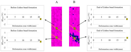 The area of Lüders band formation will be at the point on the sample surface where higher temperature, i.e., stress, changes were found before the Lüders band formation (Figure 3 in position 1A of the line analysis). The formation of the Lüders band in the same line area showed an increase in temperature changes (Figure 3, in position 1B of the line analysis).