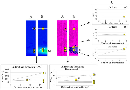 Hardness measurements (C) were performed in all positions of line analysis (1–3B) with thermography and digital image correlation at the end of the Lüders band formation (Figure 4).