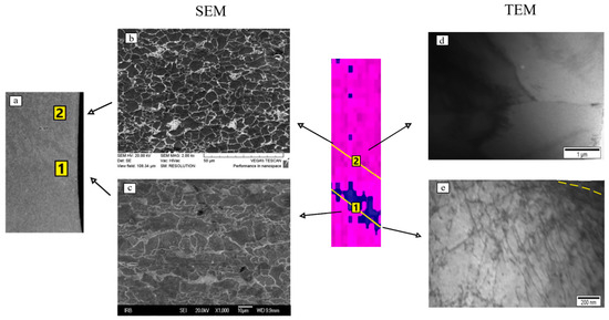 Comparison of the results of microstructure tests on the scanning electron microscope (a–c) and transmission electron microscope (d,e) with the area of Lüders band formation.