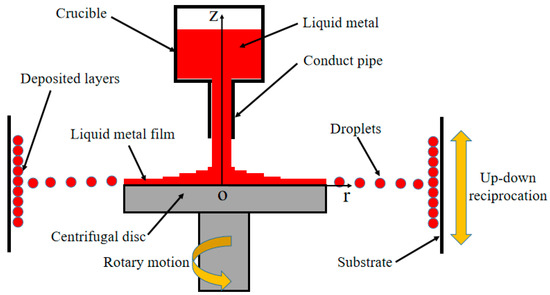 Centrifugal spray-forming technology uses the centrifugal force provided by a high-speed rotating centrifugal disc to granulate a film-like metal [1,2], and the granulated droplets are deposited on a moving substrate to form a metal blank with a refined microstructure and uniform chemical composition [3,4]. The microstructure and related mechanical properties of the deposited blank [5,6,7] are mainly determined by the size, temperature and speed of the atomized droplets, and the atomization process [8,9,10] is closely related to the flow behavior of the liquid film. Therefore, it is of great significance to study the flow behavior of liquid films for the preparation of high-performance blanks.