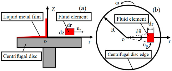 The main forms of motion of the liquid film on the centrifugal disc are circular motion along the disc surface and linear motion sliding from the center to the edge of the disc. A fluid element is taken at any radial coordinate , circumferential coordinate and axial coordinate . The radial size of the fluid element is , the circumferential size is and the thickness is . The volume of the fluid element is as follows: