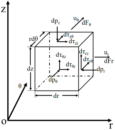 The force analysis of the fluid element in the radial and tangential directions is shown in Figure 3. The force balance equation of the fluid element can be obtained through analysis.