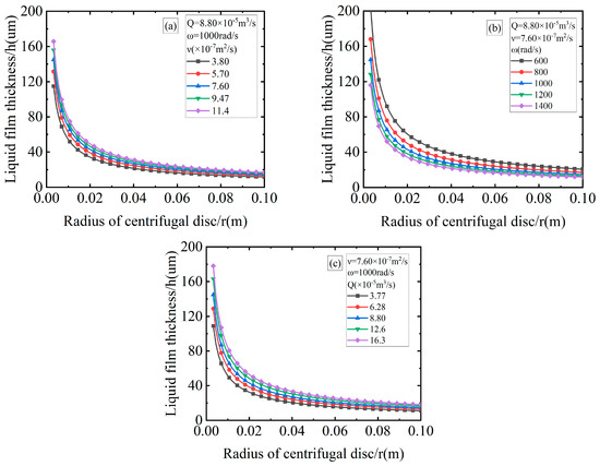 Distribution of liquid film thickness along the radial direction: (a) different kinematic viscosities; (b) different centrifugal disc speeds; (c) different volume flow rates.