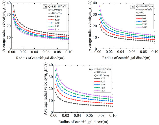 Average radial velocity distribution along the radial direction: (a) different kinematic viscosities; (b) different centrifugal disc speeds; (c) different volume flow rates.