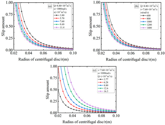 Circumferential slip distribution along the radial direction: (a) different kinematic viscosities; (b) different centrifugal disc speeds; (c) different volume flow rates.