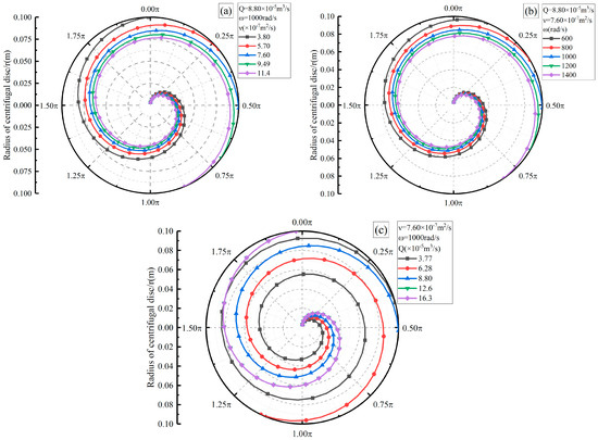 Trajectory of liquid film motion: (a) different kinematic viscosities; (b) different centrifugal disc speeds; (c) different volume flow rates.