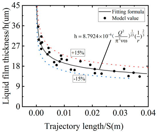 Figure 9 shows the relationship between the liquid film thickness and the trajectory length. The thickness of the liquid film decreases with the increase in the length of the trajectory, and the error between the fitted value and the model value is controlled within ±15%. The formula can be used for the design and optimization of the centrifugal disc structure. In the design and optimization, the trajectory length of the liquid film on the surface of the centrifugal disc can be increased to obtain a thinner liquid film, and then a uniform atomized droplet can be obtained.