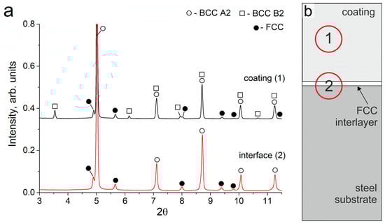 The area analyzed by the SXRD method was 200 µm in diameter; therefore, bcc grains from the bottom part of the coating were within this area. However, no reflections of the B2 superstructure were observed in this zone. It can be concluded that the bcc phase in the lower part of the coating consists mainly of a disordered bcc phase with an A2 structure. This feature was associated with a high concentration of Fe and a reduced concentration of other elements in the bottom part of the coating compared to the dendritic zone (EDX point # 3, Figure 2c and Table 3). Al and Ni are the elements that usually form an ordered B2 superlattice in the bcc. The reduced concentration of Al and Ni in the bottom part of the coating promoted the formation of bcc grains that predominantly had a disordered bcc A2 structure.
