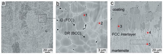 At the same time, in the main material of the coating, only the presence of Si was recorded (EDX points # 1, 2, Figure 2c and Table 3). It should be noted that the Si concentration was higher in the interdendritic fcc regions than in the bcc denditic grains. This is probably because the fcc phase crystallized at a lower temperature than the bcc dendrites, and the diffusion Si from the substrate occurred mostly along the interdendritic regions.