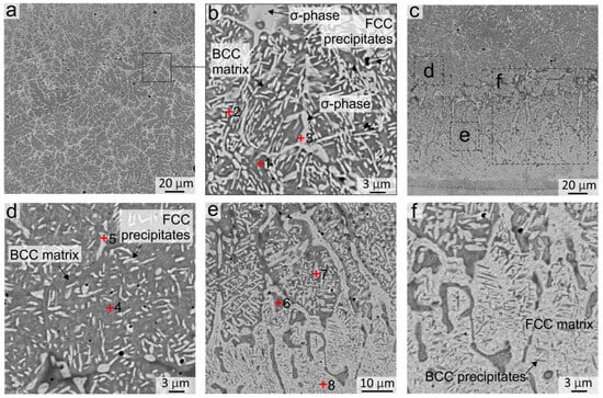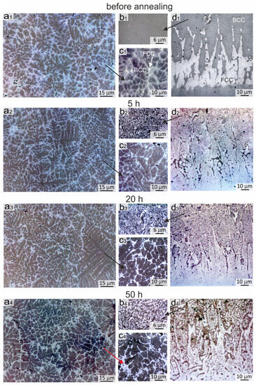 As shown above, the structure of the coating after cladding consisted of dendrites and interdendritic layers. The dendrites included the bcc phase, the interdendritic layers were mainly the fcc phase, and the concentration gradient in bcc grains was characterized by increasing Cr and Fe content and decreasing Al and Ni content closer to the interdendritic regions. The metallographic images of the sample are shown for convenient comparison with the annealed samples in Figure 3(a1,c1).