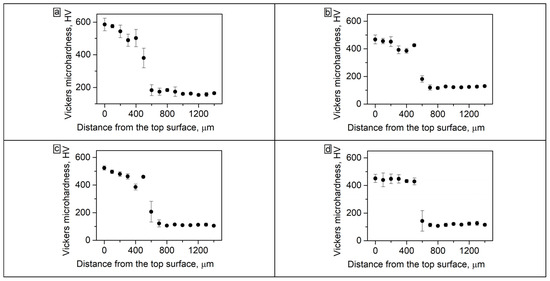 Vickers microhardness was measured using a Wolpert Group 402MVD (Wolpert, Borgharenweg, The Netherlands) machine. The measurements were performed by the line mode in the cross-section of the samples in the direction from the coating surface to the substrate. The indenter load was 0.98 N. The distance between the indentations was 100 μm.