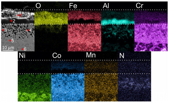 Figure 7 shows maps of element distribution in the oxide layer, which formed after the oxidation of coatings in an air atmosphere for 50 h at 900 °C. The total thickness of the oxide film was approximately 12 μm. The mass gain after 50 h of oxidation was 0.6 mg/cm2. There were no publications found by other researchers on oxidation of the same composition under the same conditions, but the results were comparable to the oxidation behavior of the Al-Co-Cr-Cr-Ni HEAs [6,7,9,10]. In the cross-section of the oxide films, two clearly distinguishable sublayers can be seen: an upper sublayer with Fe, Co, and higher Cr content on top, and a lower sublayer containing mainly Al. The phase composition of oxide films after high-temperature oxidation of Al-Co-Cr-Fr-Ni alloys was studied in detail earlier [6,7,8,9,10,11]. As a rule, Cr2O3 oxide grows in the upper layer and Al2O3 forms in the lower sublayer.