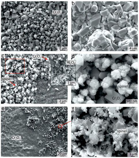 Clusters of spinel crystals with rounded edges of the plates could also be observed on the surface of the Cr2O3 oxide film (Figure 8e,f). The spinels with different morphologies in Figure 8d,f probably had different compositions, but it was not possible to determine the composition precisely by EDX due to the very small size of the crystals.