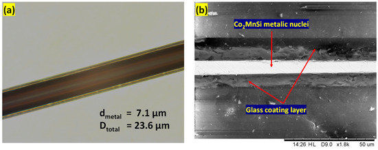 Figure 1. (a) Optical microscope and (b) SEM images of GCMWs-A illustrate the metallic nuclei of Co2MnSi and coating layer.
