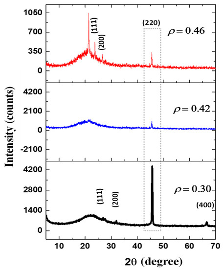 In addition, XRD structure analysis was conducted to explore the order state of Co2MnSi-GCMWs and study the impact of the aspect ratio on the crystalline structure. The representative findings are illustrated in Figure 2. The (111) and (200) superlattice reflections are clearly observed at 2Ө = 27.67⁰ and 32⁰ positions in the XRD diffractogram for GCMW-A, i.e., ρ = 0.3. As described in our previous publications [15,17,32], such XRD diffractogram is attributed to a fully ordered cubic L21 austenitic structure. Nevertheless, these two superlattices’ diffraction (111) and (200) peaks are significantly weaker as compared to other superlattices’ peaks belonging to the same diffractogram. Therefore, the intensities of these peaks may be essentially undetectable if the majority or all of the elements in the present alloys belong to the same period in the elemental periodic table [37]. Commonly, these two XRD diffraction lines will not appear if samples demonstrate such a disordered cubic A2 crystal structure [38]. Given that Mn (3d54s2) and Co (3d74s2) belong to the same period (period 4) in the periodic table, GCMW-B, i.e., ρ = 0.42, may have a disordered phase with the cubic A2 type structure. Moreover, in this diffractogram, we can observe the absence of a (400) peak around 2Ө = 65°, the presence of which is usually expected in the A2 structure. There is a possibility that the crystallites are too fine to be recognized via X-rays, as previously noticed [39]. For the 2Ө < 25°, GCMW-A and GCMW-B have a noticeable halo originating from the glass coating layers, as reported in our previous works [19,30,31,32]. Another XRD analysis is obtained for the samples with ρ = 0.46, where mixed structures with L21 and B2 embedded with the amorphous halo are observed. The order and disordered microstructure overlap with the amorphous halo in this sample. For a more detailed explanation, see [29]. Additionally, similar scattering effects of the constituent elements (Co, Mn, and Si) can explain the absence of some XRD peaks [40]. Subsequently, when both XRD spectra are compared, the well-defined diffraction patterns presented in GCMW-A reflect high crystallinity. The intensity of the diffraction peak then weakens with increasing the ρ -ratio, as reported and discussed in our previous investigations [41]. This proves that with relatively low crystallinity, the crystalline size diminishes compared to GCMWs-B. It is important to note that superstructure peak intensities can be affected by various types of atomic disorder [19]. As we know, Co2MnSi compounds can be described as X2YZ Heusler alloy types. Therefore, for a deeper understanding of the L21 and A2 phases, the arrangement of atoms in both crystal structures can be discussed. It can be realized that the L21-type belongs to the cubic Fm3¯m space group, which is made up of four interpenetrated face-centered cubic (FCC) sublattices. Considering the X2YZ type, in our case, Co (X), Mn (Y), and Si (Z) occupy the following Wyckoff positions: Si (Z) is the main group element with the highest electronegativity, which occupies 4a (0 0 0), Mn (Y) is the lower-valence transition metal atom with the smallest electronegativity, occupies 4b (0.5 0.5 0.5), and Co, the transition metal (X) atoms, are of intermediate electronegativity and occupy 8c (0.25 0.25 0.25) and (0.75 0.75 0.75) [42].