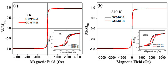 Figure 3. Hysteresis loops measured at (a) 5 K and (b) 300 K for Co2MnSi GCMW-A and GCMW-B. (The insets show (a,b) the low-scale M-H loops of samples).