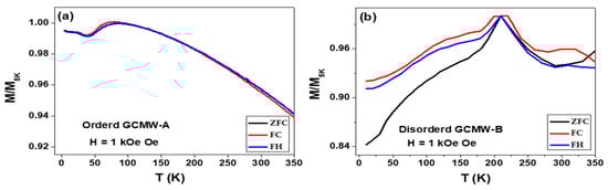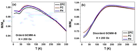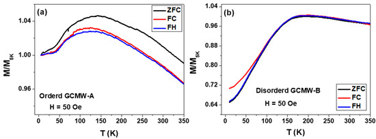 When a weak external magnetic field is applied, i.e., H = 50 Oe, noticeable differences are observed when measuring the ZFC, FC, and FH curves for the ordered sample (GCMW-A) and the disordered sample (GCMW-B) (see Figure 4). Both samples show large irreversibility: the magnetization curves start to decrease by decreasing the temperature from 350 K to 5 K. The characteristic point, such as the irreversible temperature (Tirr) for the ordered sample, has shifted to the low temperature (Tirr ≥ 120 K); however, Tirr ≈ 175 K for the disordered sample. The ZFC, FC, and FH curves appear to match perfectly in a temperature range from 350 K to 70 K, while below T = 70 Ka, a notable mismatch between the FC and ZFC is detected. For the ordered sample, a notable mismatch between the ZFC, FC, and FH curves is observed (see Figure 4a). Assuming the difference between magnetization curves as (ΔM), ΔM between ZFC and FC&FH is much higher than ΔM between FH and FC for the ordered sample at all measuring temperatures. In contrast, ΔM ≈ 0 for the disordered sample at a temperature range of 350–70 K.