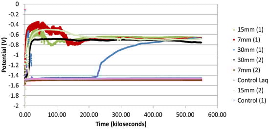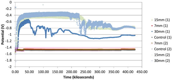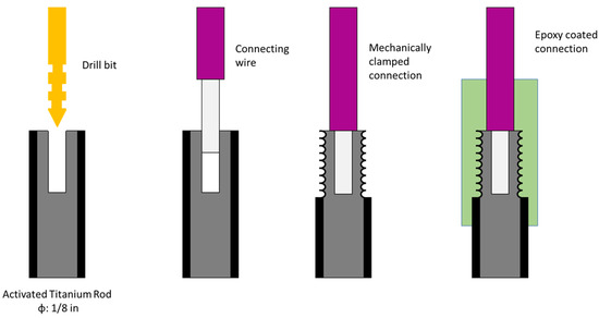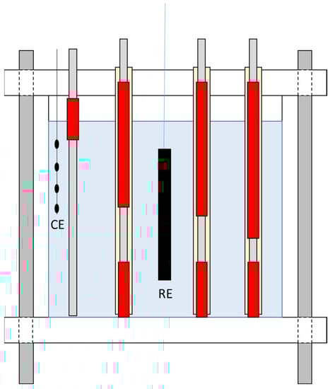 - Castro, P.; Sagüés, A.A.; Moreno, E.I.; Maldonado, L.; Genescá, J. Characterization of activated titanium solid reference electrodes for corrosion testing of steel in concrete. Corrosion 1996, 52, 609. [Google Scholar] [CrossRef]