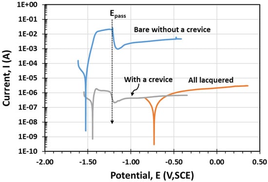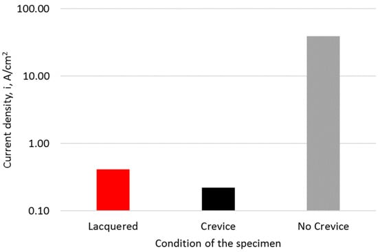 - The EIS results show high impedance values of the specimens with crevices; however, this can be attributed to the relatively small area of exposure. Apparent corrosion rates showed that all active specimens corroded at relatively the same rate (~0.75–3 µm/y).
