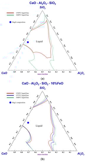 CaO-Al2O3-SiO2-FeO phase diagram and composition of each slag at the experiment temperature: (a) slag0; (b) slag1; and (c) slag2.