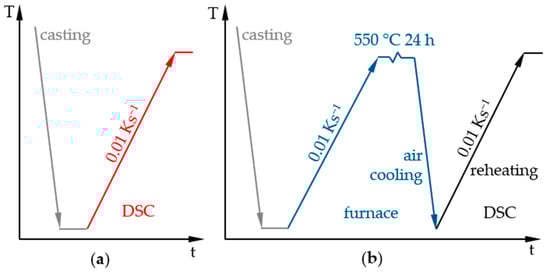 First, linear heating experiments were performed in a DSC at a rate of 0.01 Ks−1 to investigate the as-cast material (Figure 1a). The heating rate was chosen based on those that are typically used in industry. The heating experiments were performed in a SenSys Evo DSC (SETARAM, KEP TECHNOLOGIES SA, Mougins, France) with a sample size of Ø6 × 21.65 mm (mass ca. 1650 mg). The DSC experiments were carried out and evaluated using the method described by Kemsies et al. [7]. In addition, reheating experiments after previous standard homogenisation were carried out to investigate the influence of prior homogenisation (Figure 1b). The standard homogenisation parameters, 550 °C for 24 h, were also chosen based on those that are typically used in industry. In this case, the previous homogenisation at 550 °C for 24 h was performed in the chamber furnace CWF 1100 (CARBOLITE GERO GmbH & Co. KG, Neuhausen, Germany)., followed by air cooling. The samples were then frozen at −80 °C until DSC examination to preserve their condition.