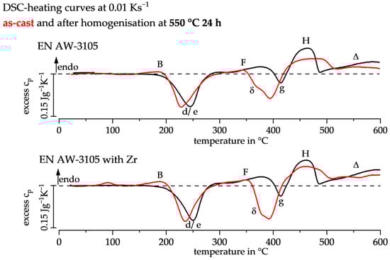DSC heating investigations were carried out to understand the supersaturation and the precipitation kinetics of the material from the as-cast state. Figure 3 shows the DSC heating curves with a heating rate 0.01 Ks−1 of both investigated alloys from the as-cast state (red curve) and after homogenisation at 550 °C for 24 h (black curve). The course of all four heating curves is similar. The DSC heating curves essentially show a sequence of exothermic and endothermic peaks. It should be noted that DSC always measures the sum signal, i.e., exothermic and endothermic reactions can overlap. During an exothermic peak, precipitation occurs (marked with lower case letters), whereas during endothermic reactions, dissolution occurs (marked with capital letters).
